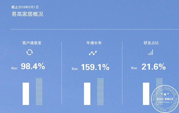 歷經(jīng)15年品牌積淀,易高家居逐漸成長(zhǎng)為成熟的定制企業(yè),截止2018年5月,相較2017年易高家居增長(zhǎng)率高達(dá)159.1%,如此迅猛的增占率讓易高為更多消費(fèi)者和行業(yè)所認(rèn)可,也奠定了其全屋定制一線品牌的地位。
