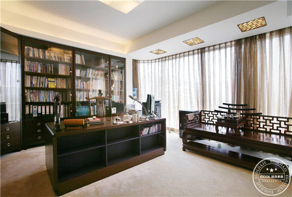 文化的交流與碰撞具有巨大的魅力,中式造型配以現(xiàn)代設(shè)計(jì)元素,整個(gè)書(shū)房的空間顯得更加豐富,大而不空,厚而不重,有格調(diào)又不顯得壓抑,使得書(shū)房環(huán)境本身就迸發(fā)出厚重的文化因子。