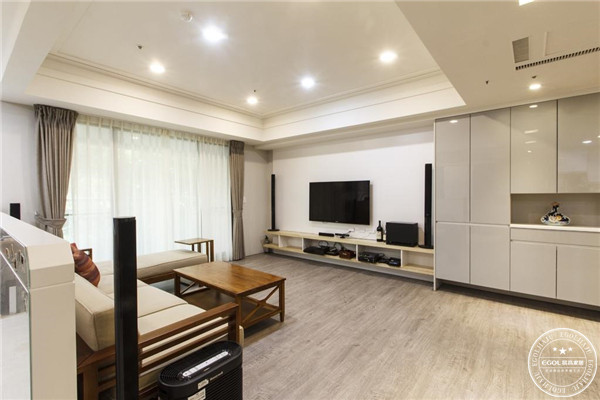電視柜與裝飾收納柜、書柜合體,滿足多種收納需求,也讓空蕩的墻面看起來更加雅致,電視組合柜設計可以讓房間看起來更加整齊,同時也可以騰出了更多的活動空間。貼墻懸掛的電視調節(jié)好正確的視覺高度,讓觀看更舒適。有設計感的吊柜增加客廳的時尚感,也更加有效利用空間,空出地面空間。