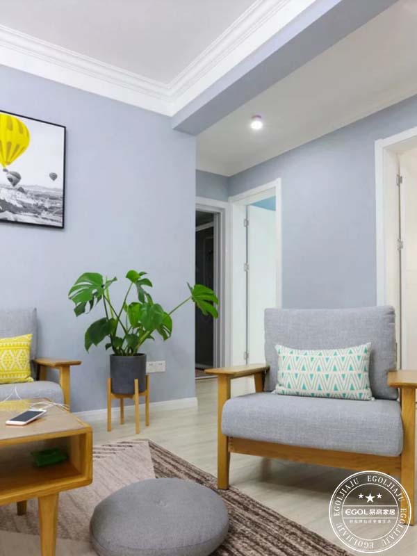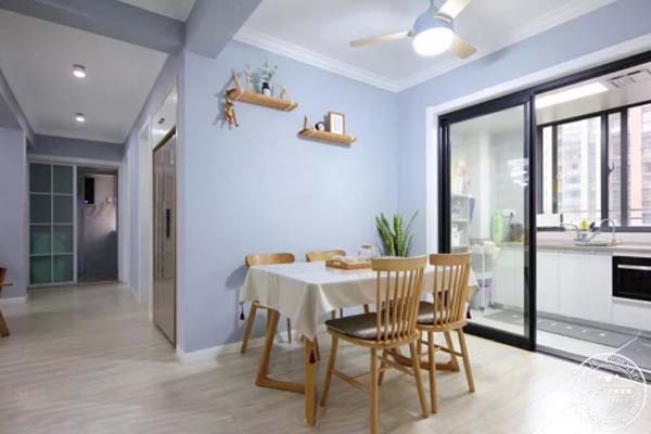 喜歡簡單明亮的北歐風(fēng),整個(gè)餐廳客廳都是采用藍(lán)灰色調(diào)打底,這個(gè)顏色硬是讓師傅調(diào)了整整三個(gè)小時(shí)才給整出來,哈哈本來想用文化磚,后來發(fā)現(xiàn)網(wǎng)上買的都是瓷片磚,工人鋪貼費(fèi)用就要一兩千,最后果斷放棄,無意中發(fā)現(xiàn)硅藻泥也有這種類似文化磚的式樣,就做了硅藻泥還環(huán)保。不喜歡那種大大小小密密麻麻的掛畫,選擇了簡單款式,同等大小的掛畫,呼應(yīng)沙發(fā)墻面窗簾的顏色,效果很滿意。