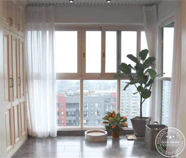 白色的窗簾保留了陽(yáng)臺(tái)的透光性,將陽(yáng)臺(tái)處的地面換成了地磚,種植物不用擔(dān)心沒(méi)有陽(yáng)光,也不用怕滲透的水將地面損壞。左邊增加了一個(gè)儲(chǔ)物柜,不常用的東西可以放在里面,增加了收納功能。