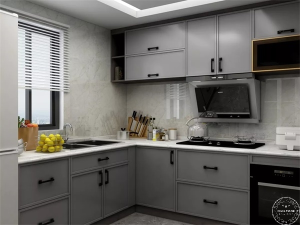 廚房要方便做飯,有足夠的空間放置物品。設(shè)計(jì)的關(guān)鍵在于利用空間定制操作臺面,打造吊柜。
