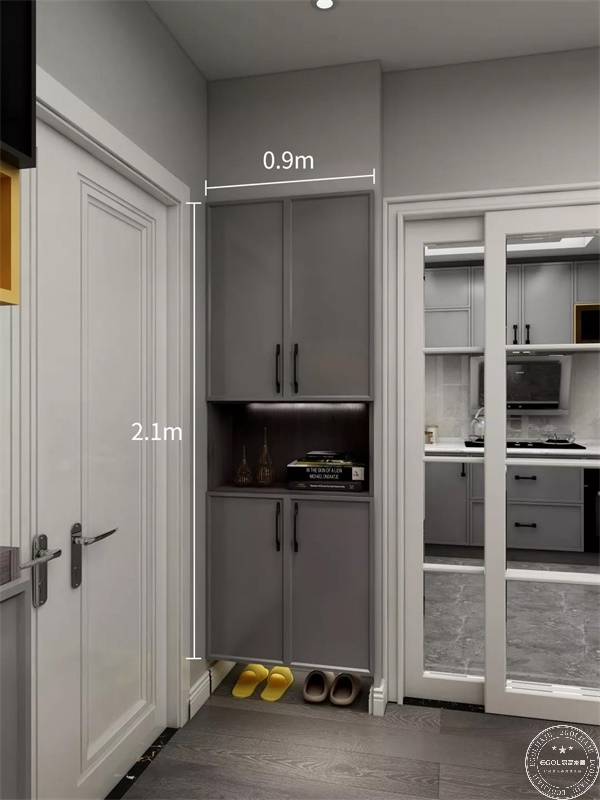 下方是鞋柜,中間是鏤空的展示區(qū)。展示區(qū)是主人表現(xiàn)個性的天地,可以根據(jù)自己的愛好、情調(diào)來打造,同時也為客廳增添了一道獨(dú)特的風(fēng)景線。